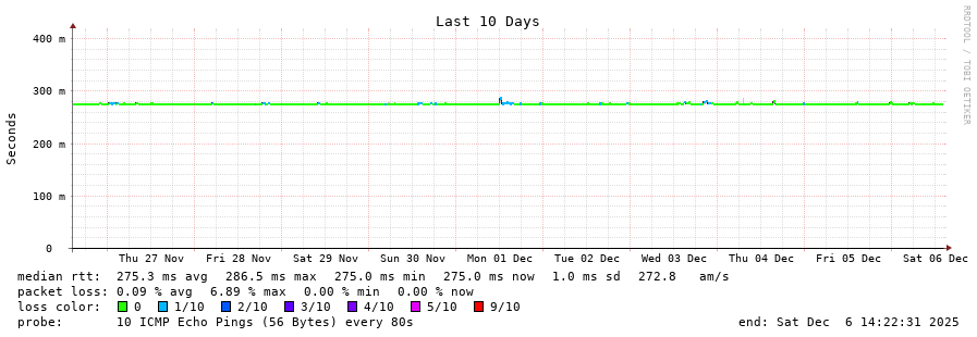 14 > tserv2.hkg1.he.net (216.218.221.6) [AS6939] 274.602ms 274.584ms 274.627ms