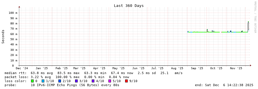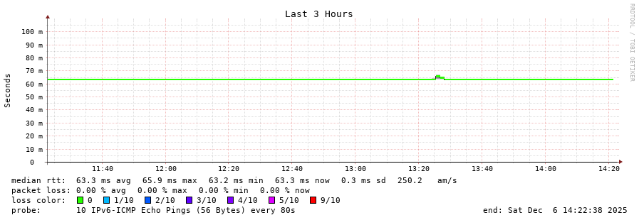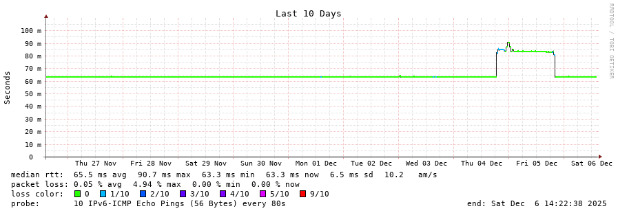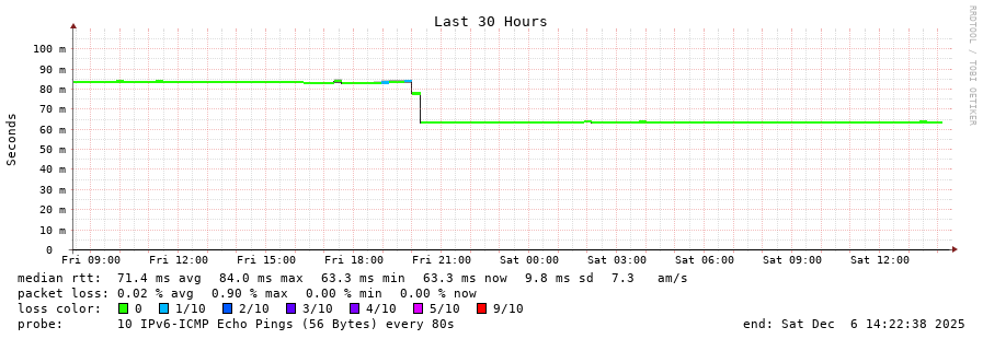 traceroute to 2a05:9f04:16:10::65 (2a05:9f04:16:10::65), 30 hops max, 80 byte packets - Generated at 2025-12-06 14:15:01
