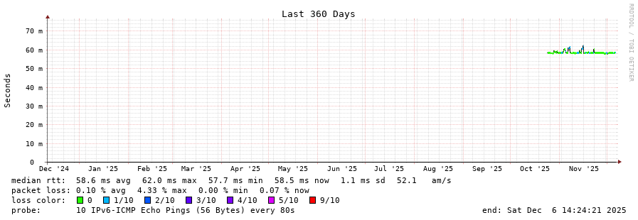 traceroute to 2a03:8f84::f1b6:9702:29c:9062 (2a03:8f84::f1b6:9702:29c:9062), 30 hops max, 80 byte packets - Generated at 2025-12-06 14:15:01