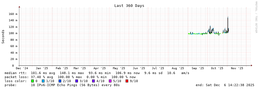 traceroute to 2001:49f0:d0b0:6::2 (2001:49f0:d0b0:6::2), 30 hops max, 80 byte packets - Generated at 2025-12-06 14:15:01